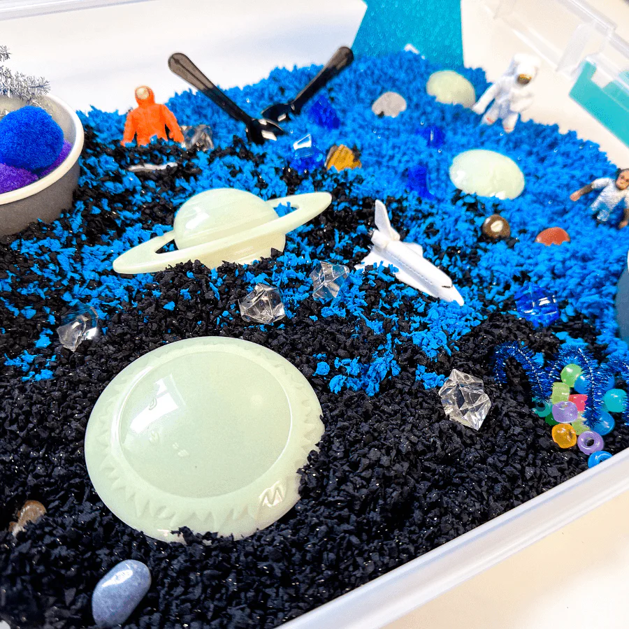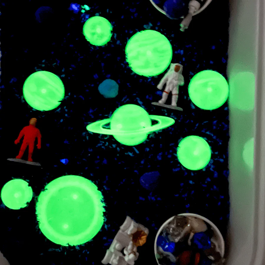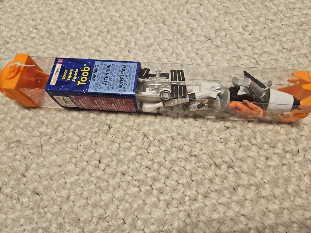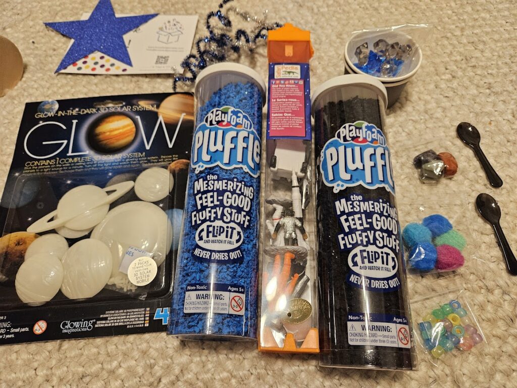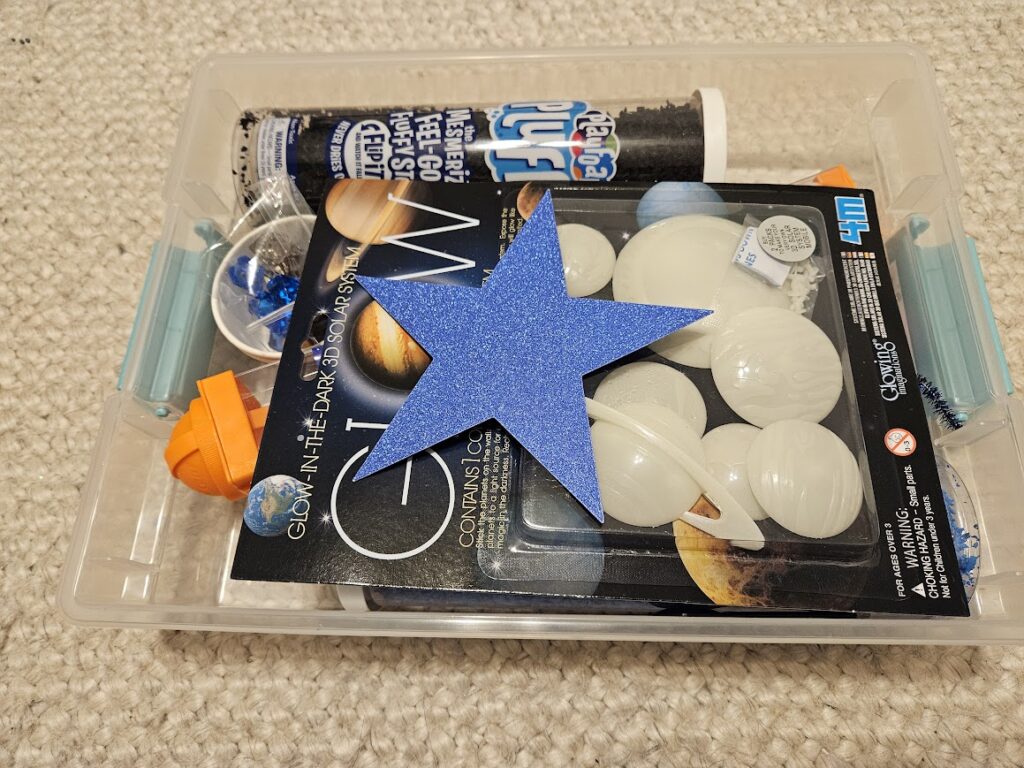 I bought this for Aryi as one of his Christmas presents. He loves to play with sensory bins. He especially loves these Knowledge Crate ones. We have not talked about space much. I thought this could be a good introduction.