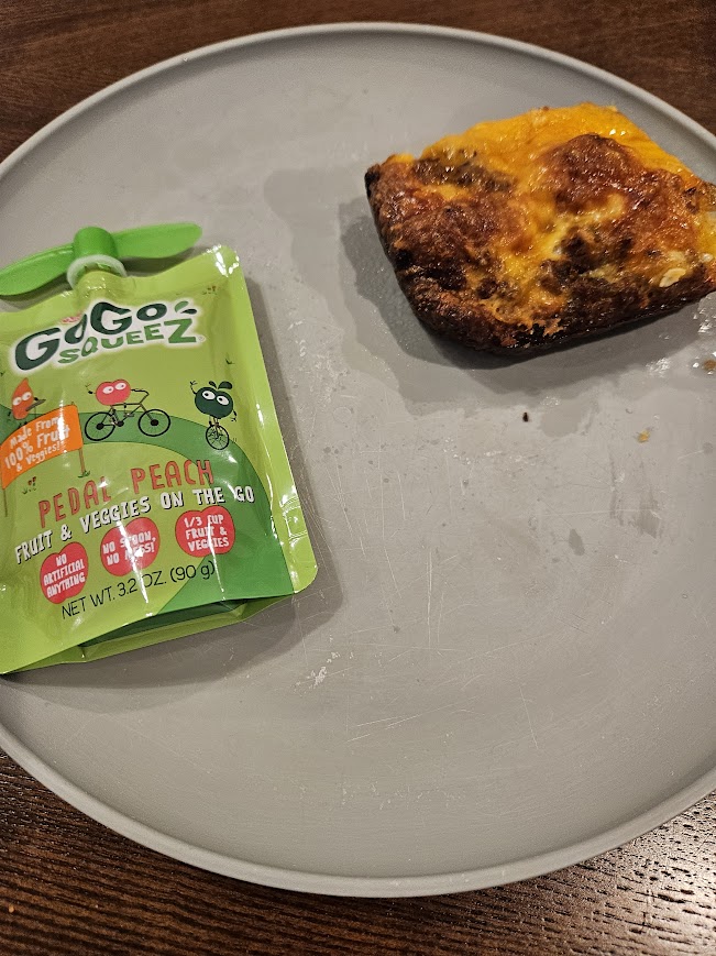 Breakfast – 08:00am – Breakfast Casserole (Croissant, Eggs, Cheese, and Breakfast Sausage) and Fruit and Veggie Pouch
