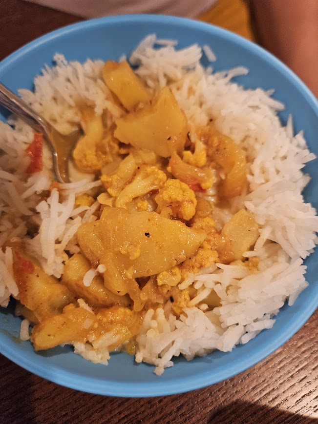 Dinner – 06:00pm – Curry Potatoes and Cauliflower over Rice