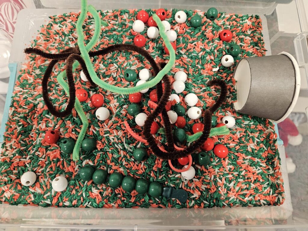 Red and Green – This basket has green and red beads and pipe cleaners for stringing. Aryi has been loving stringing things lately.