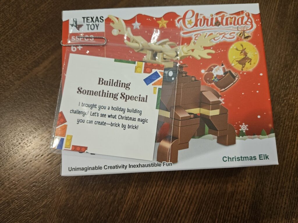 Christmas Elk Legos (substitute tree and santa) – $9.95 https://amzn.to/4bSnt1D