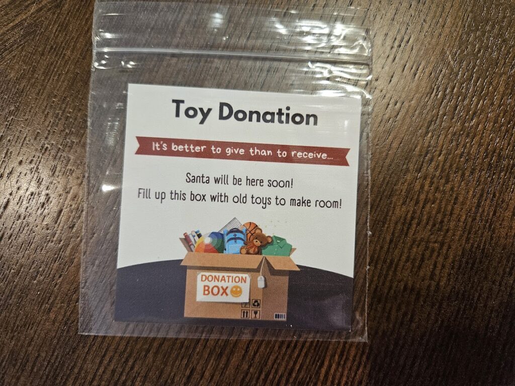 Toy Donation – This works for some people, I don’t think this works for everyone. It is a nice thought though. I know this is a season for giving. We donate toys when we go through them periodically, not just one random toy in December. I recently donated/rehomed quite a few toys. This happened in January when I had time to fully go through and clean out the toys. Not a fan of this one.