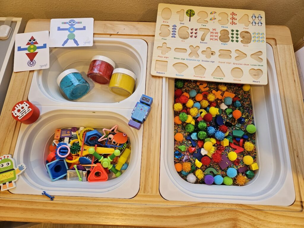 Robot Sensory Bin – I needed more sensory bin materials and I thought this fit with the rainbow rice.