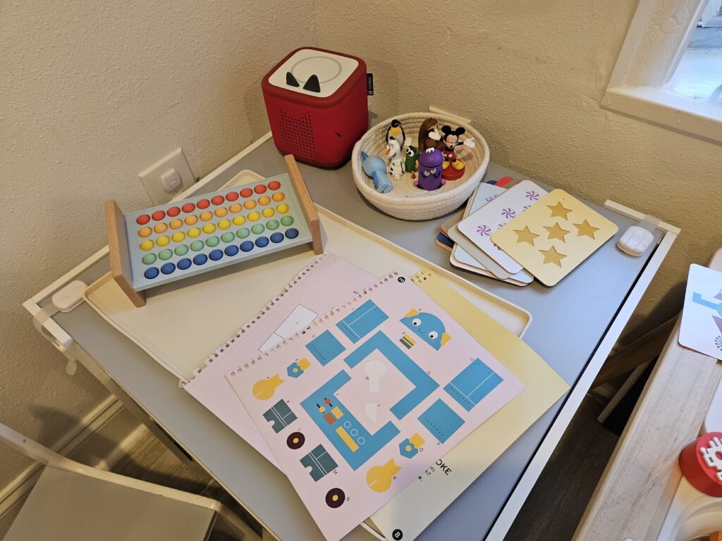 Tonie Box and Tonies – This stays out. We have tons of Tonies in Aryi’s room, I switch these out for him.