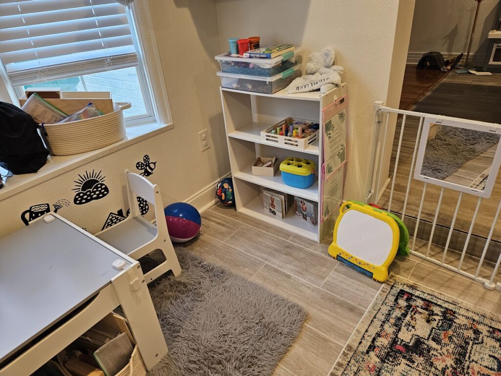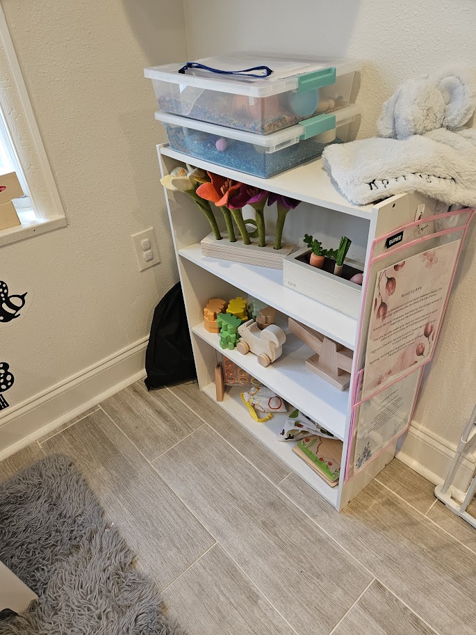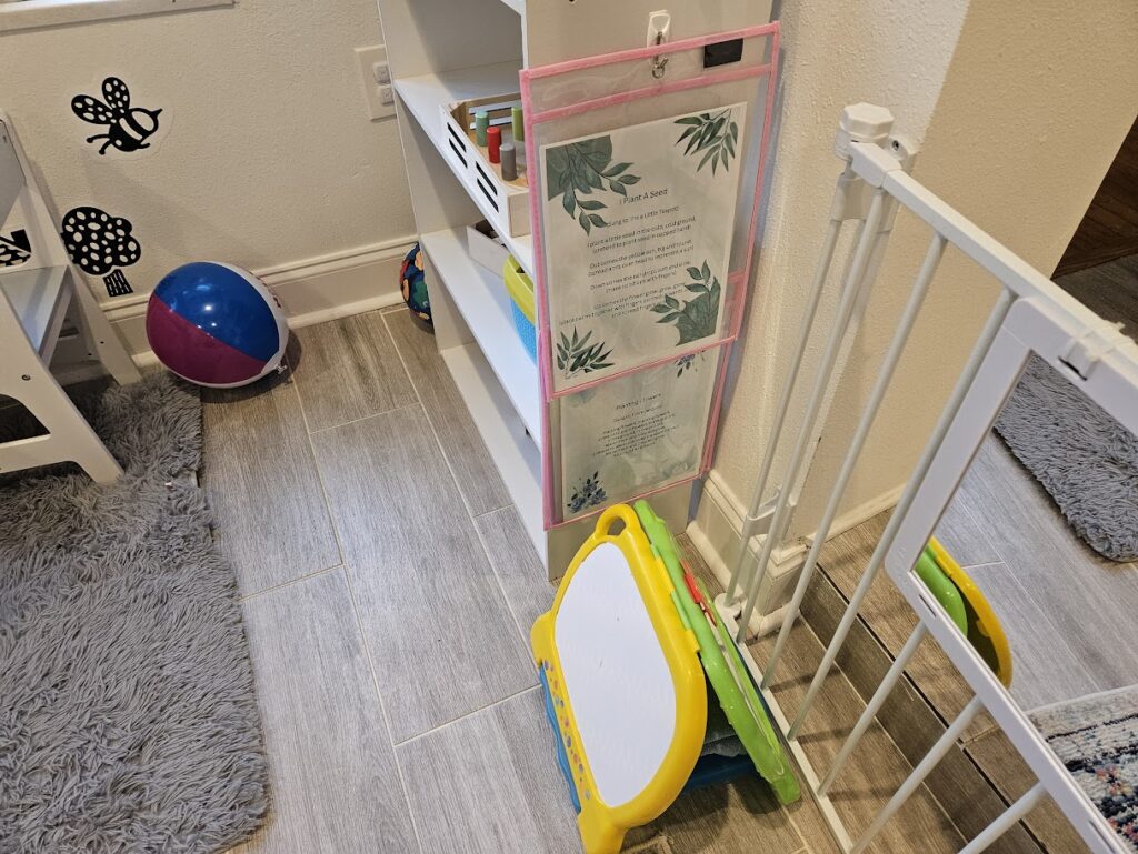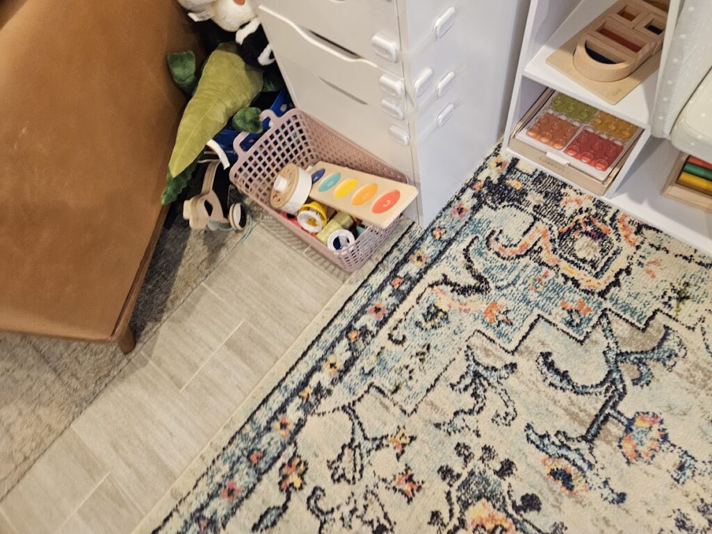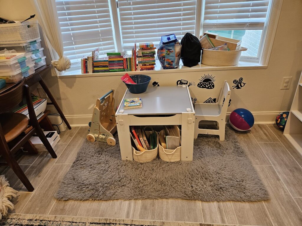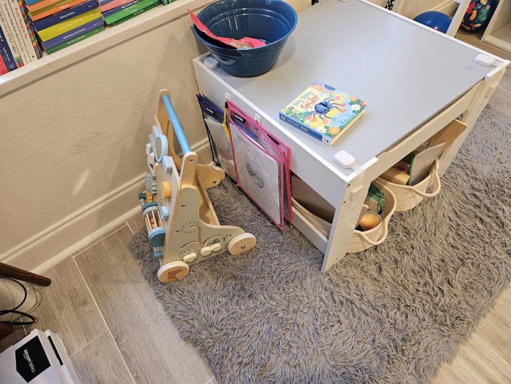 Music Basket – Always out and available. I am switching these out every few weeks. I have found it useful to keep out instruments. They can keep him busy without him needing me.