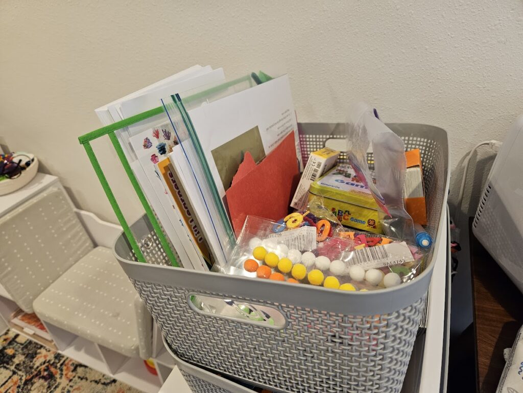 Extra Stuff Basket – This will always be out and available now. Basically this is a basket of stuff to do when we get bored with what is out. It includes coloring books, ABC flashcards, outdoor activity flashcards, animals, ISPYS, Library crafts and extra crafts we didn’t get to yet.