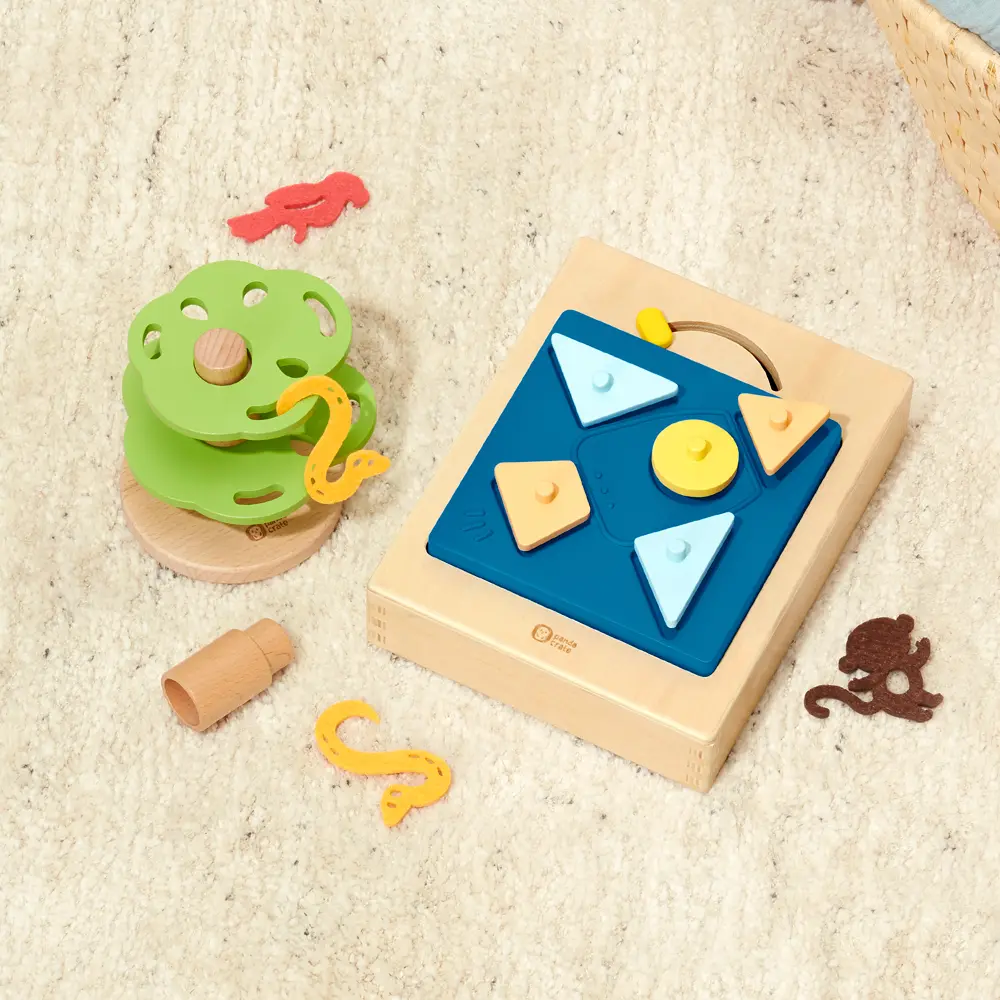 This puzzle is super cute, but just not advanced enough for Aryi. He mastered peg puzzles like this when he was one. He finishes it with half the time left. He has pretty much grown out of this toy before he even got it. It is of a nice quality, but it should be in an earlier crate. Amazon dupe is about the same price.