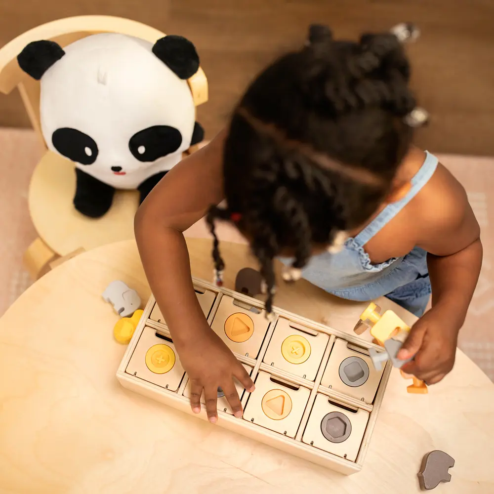 This is the saving grace of this box. This is the only toy that makes since for this age. Aryi is working on locks now. This cute box has locked cubbies filled with little wooden animals and scenes of where they live. This is a great toy. You match the shapes, colors, and animals. There is a ton of opportunity for fun and learning with this toy. I found a dupe that is $4 cheaper, but it is not nearly as cool.